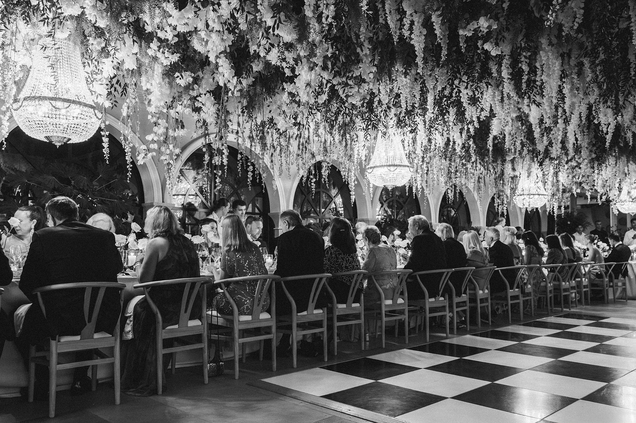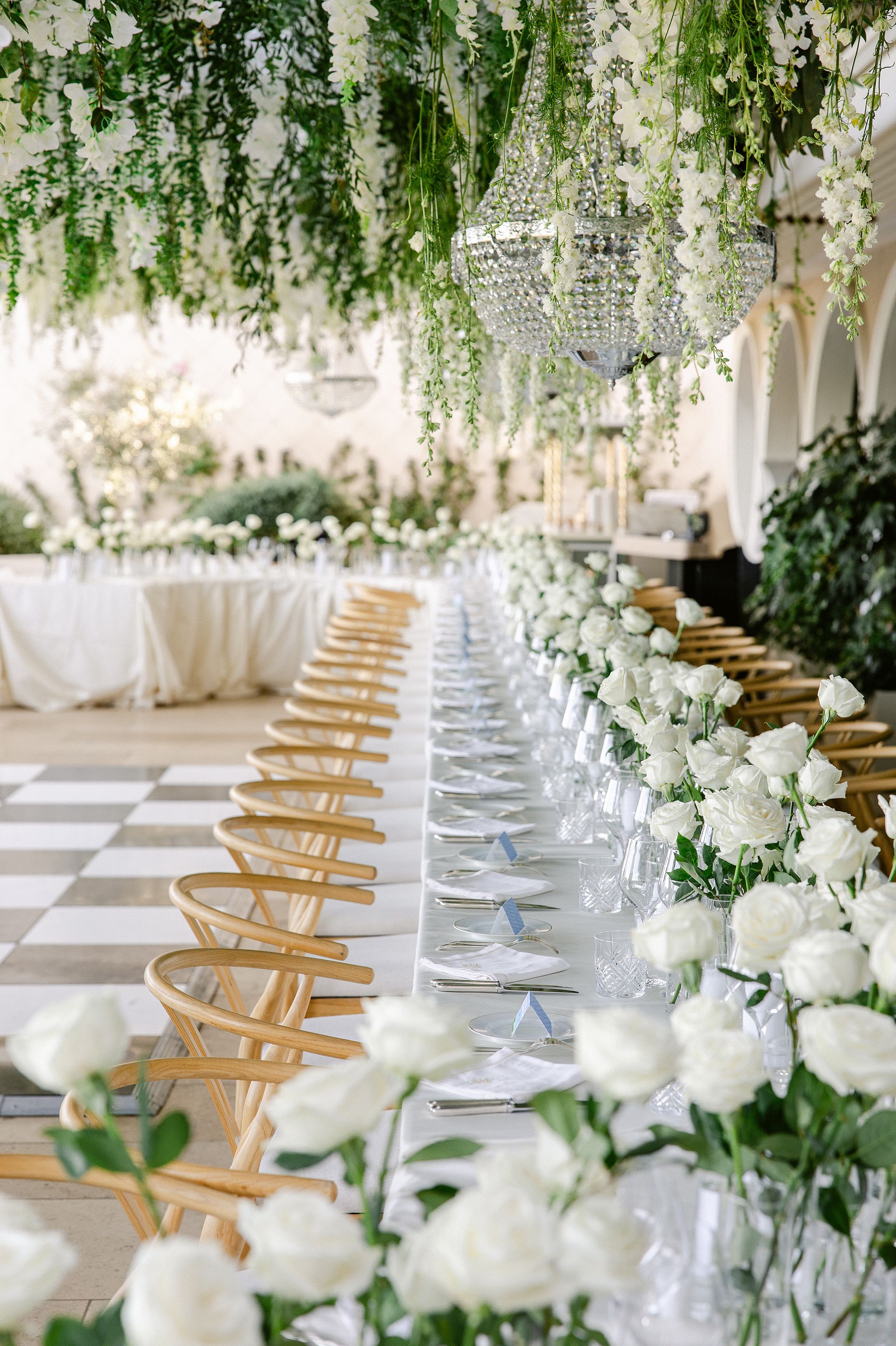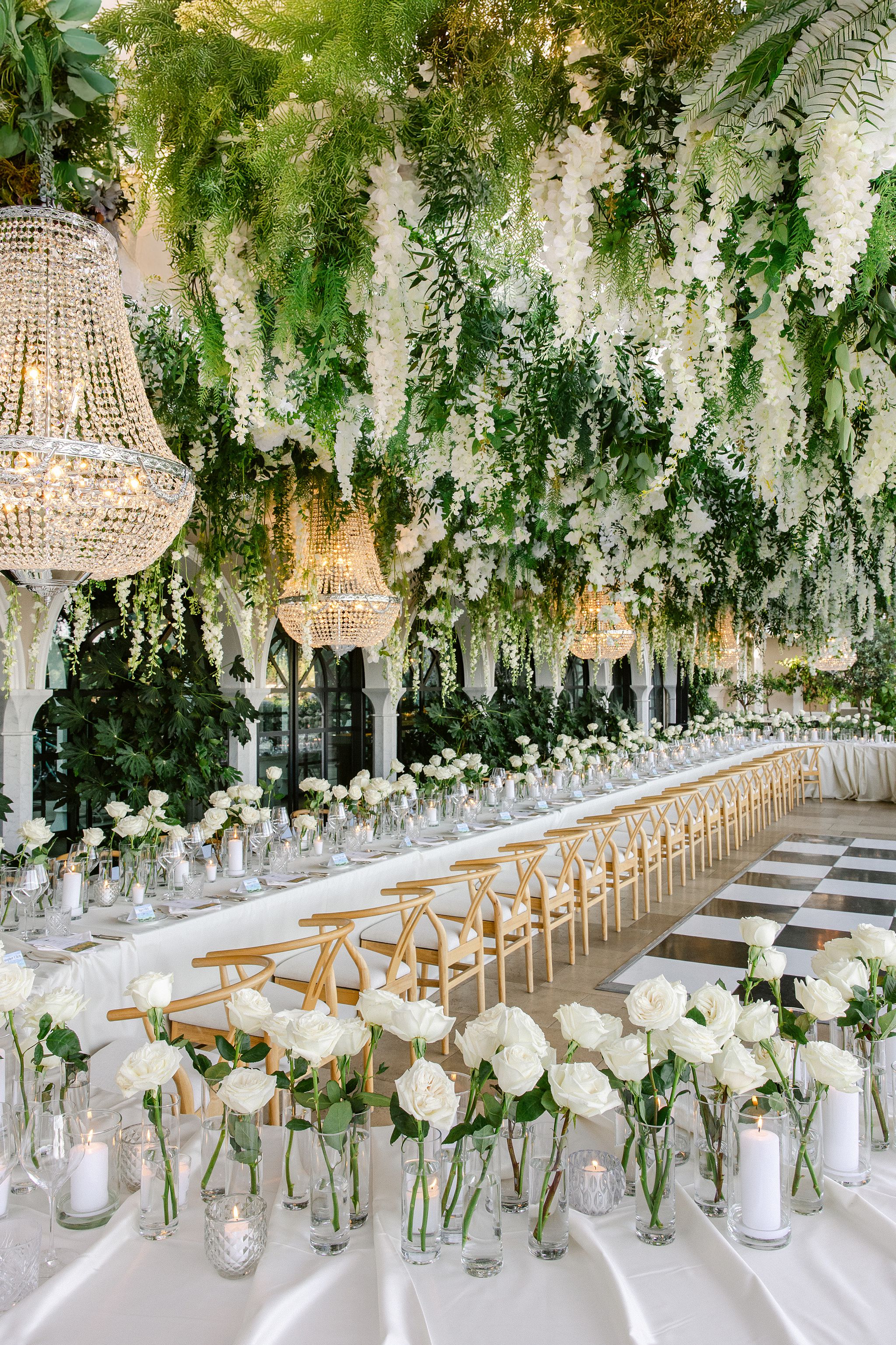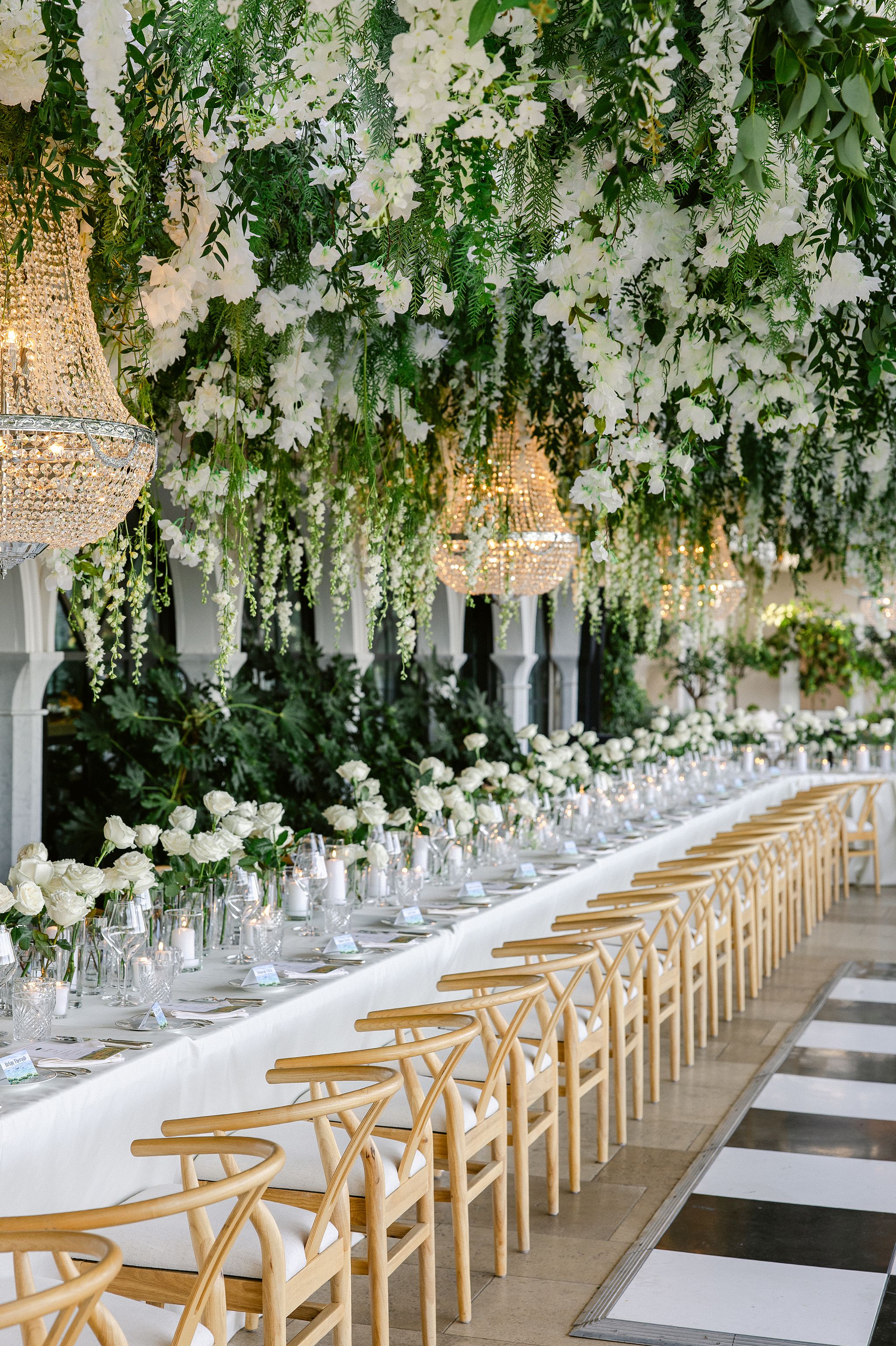 The reception dinner, designed with cascading florals and chandeliers, created an atmosphere of modern elegance and warmth.