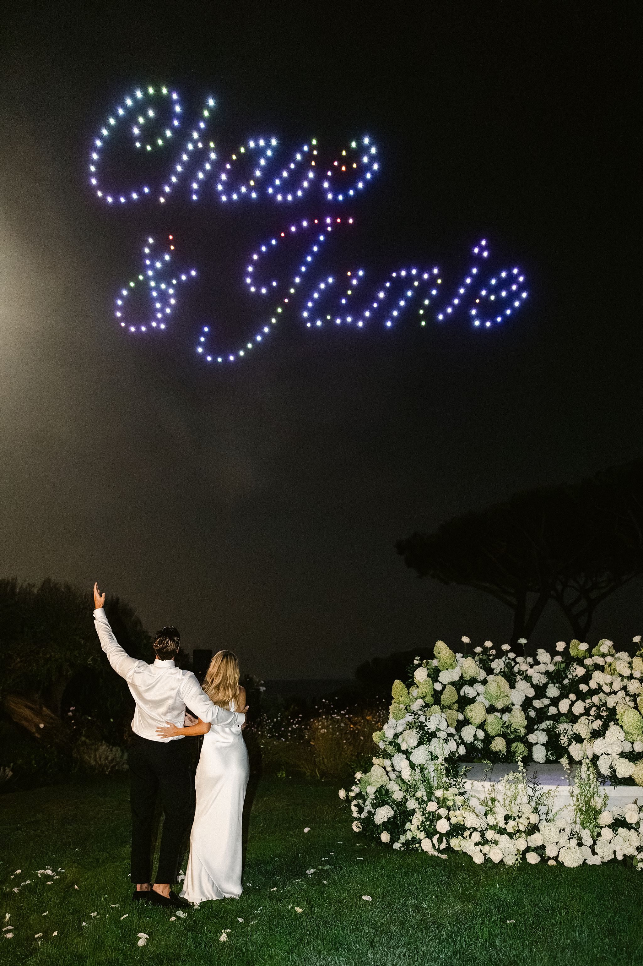Welcome venue: @jardintropezina / Ceremony music: @string_quartet_elegy / Ceremony officiant: @marcusarmstrongcelebrant / Drone show: @allumee.show / Sound and lights: @gnbtechnique13 / Furniture: @jolibazaar, @balmrental, @options_nice / Production: @advance.event_management / Dancefloor: @donna.design / DJ: @thomasdusseune / Chandeliers: @phos_events / Make-up and hair: @onedayhero_makeup
